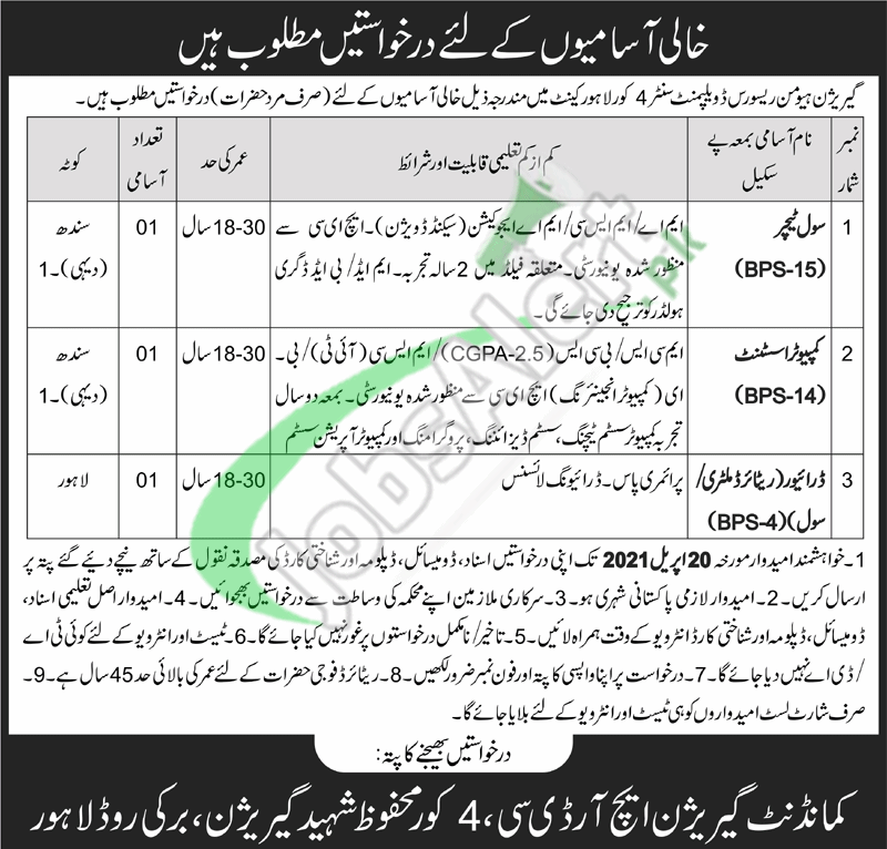 | Civil Teacher Job in pakistan Army, Garrison HRDC Lahore Jobs April 2021 for Driver, Teacher, computer operator |